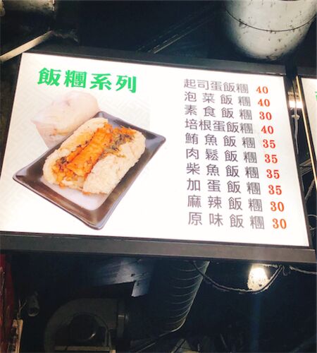 台湾のおにぎり おはようございます、旅しんと申します。 朝ごはんの買い出しに参りましょう。 台湾と言えばおにぎり! おにぎりは、飯糰と書くのですね。 これが素敵なんですよ メニューを見ます。 全く検討がつかない旅しんは、写真を指差し 「これ、これ…